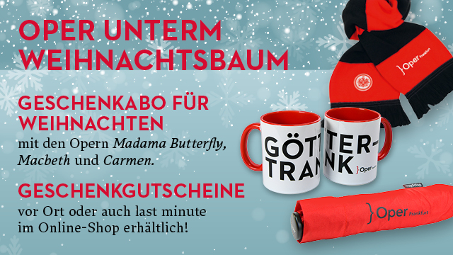 Gutscheine, Merchandise und viele weitere Geschenkideen für Opernfans gibt es in unserem Onlineshop, an der Vorverkaufskasse und bei jeder Vorstellung. Entdecken Sie z.B. den Oper-Eintracht-Fanschal, unseren Oper Frankfurt-Schirm, die Göttertrank-Tasse u.v.m.