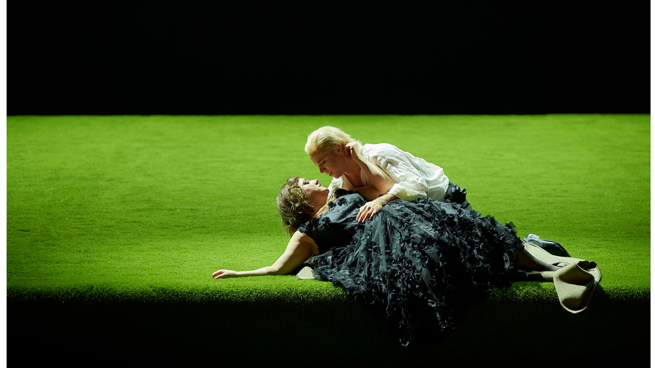 Ein schlichtes Setting, aber auf dem gepflegten Gras fällt man immerhin weich, wenn man wie Aeneas schon zur (sofort feurigen sowie rauschenden) Ouvertüre vom Schicksal und heftigem Wind hin- und hergeschleudert wird. Michael Porter betreibt das mit Hingabe, sein Tenor aber sitzt wieder glänzend und klingt markig und doch fein.