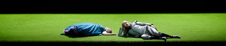 (…) Dass das alles so exzellent funktionieren konnte, resultierte auch aus dem Bühnenbild. Anna-Sofia Kirsch lieferte lediglich eine halb schräge grüne Grasfläche, vor deren Hintergrund konnten die Phantasiekostüme mit barocken Reifröcken, Uniformen und mit Federkronen von Katrin Lea Tag einerseits zur Geltung kommen, aber auch gleichzeitig die Belanglosigkeit der menschlichen Eitelkeit demonstrieren. (…)