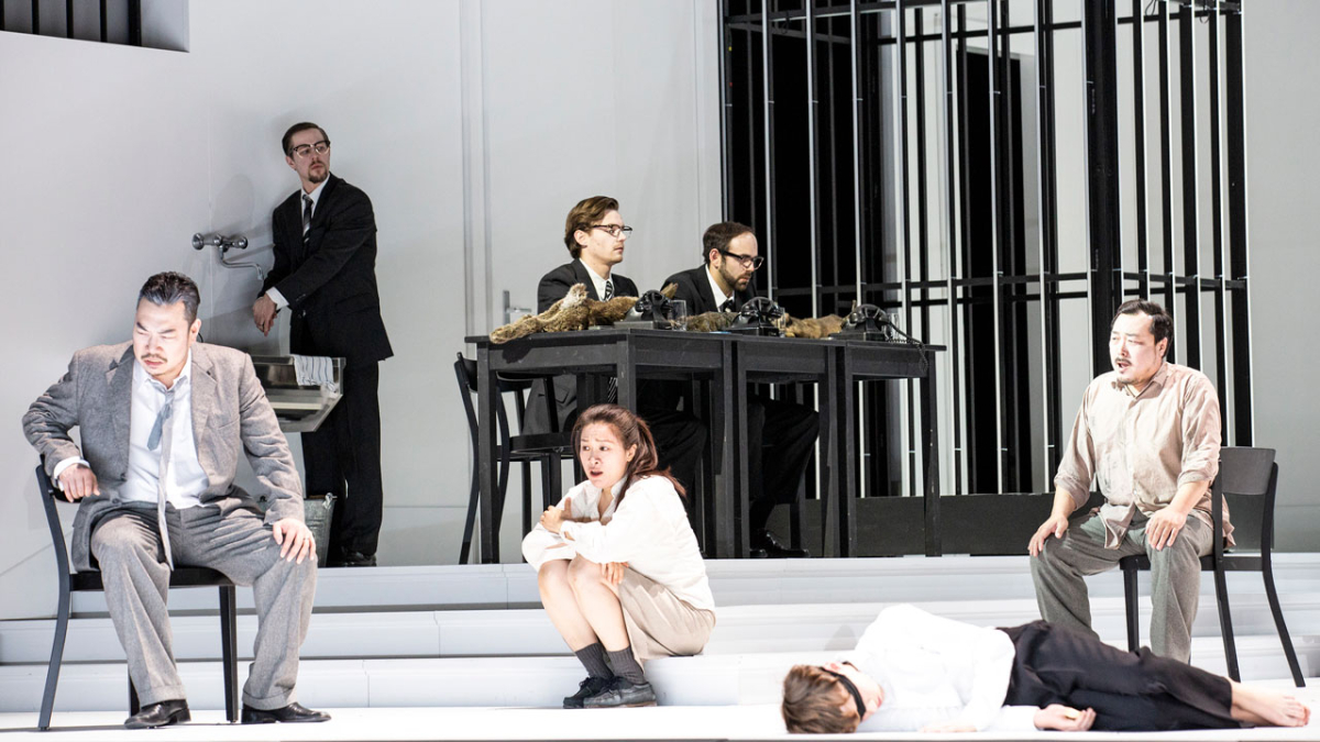 So viel Beweis echter Liebe hält Turandot nicht aus: Eiskalt ersticht sie den nächstbesten ihrer kampfsportbewehrten Wächter. Ins unbarmherzige Konzept eingepasst finden sich sogar Ping, Pang, Pong, die drei Bediensteten der Macht. Immer bedacht auf streng geometrische Bewegungen, bieten zu Beginn des zweiten Akts Liviu Holender, Magnus Dietrich und Michael Porter eine bürokratische Realsatire, wie sie nicht nur in Diktaturen an der Tagesordnung sein dürfte. Ein Tanz der Aktendeckel; Humor, Ironie, aber grimmig, von der Musik sekundiert mit grellen Effekten und süffisant säuselnd dort, wo die drei von ihren Besitztümern schwadronieren.